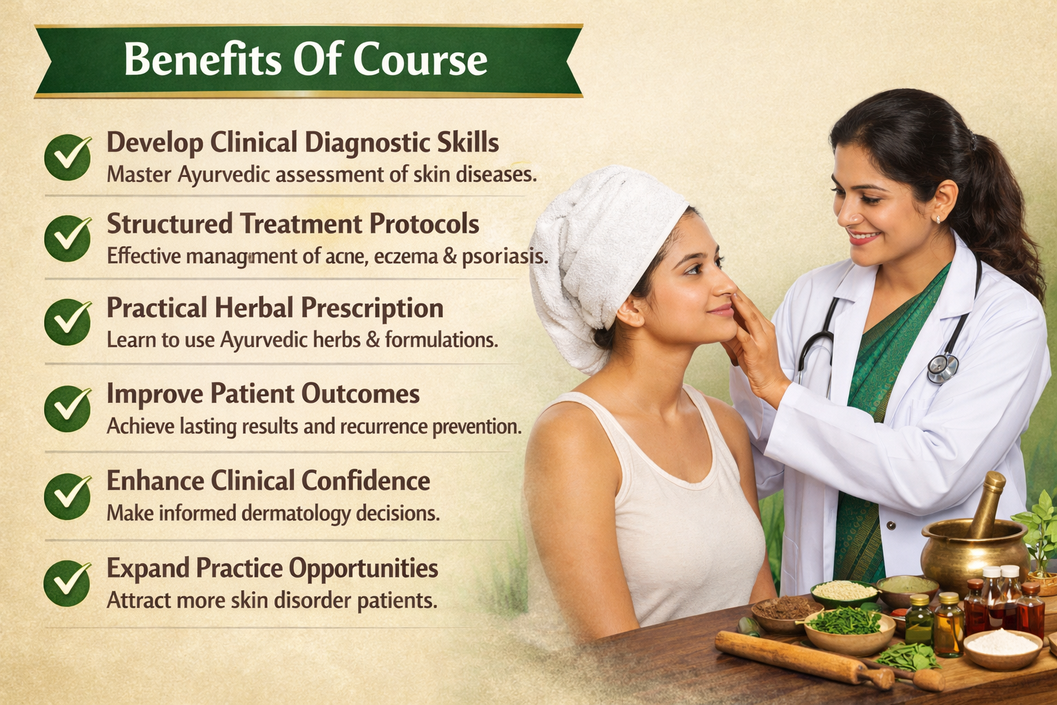 Here You can Practice in Ayurvedic Dermatology and Cosmetology after BAMS. We Provides clinical training to ayush doctor in both deramtolgy and cosmetology to give them a career speciality.